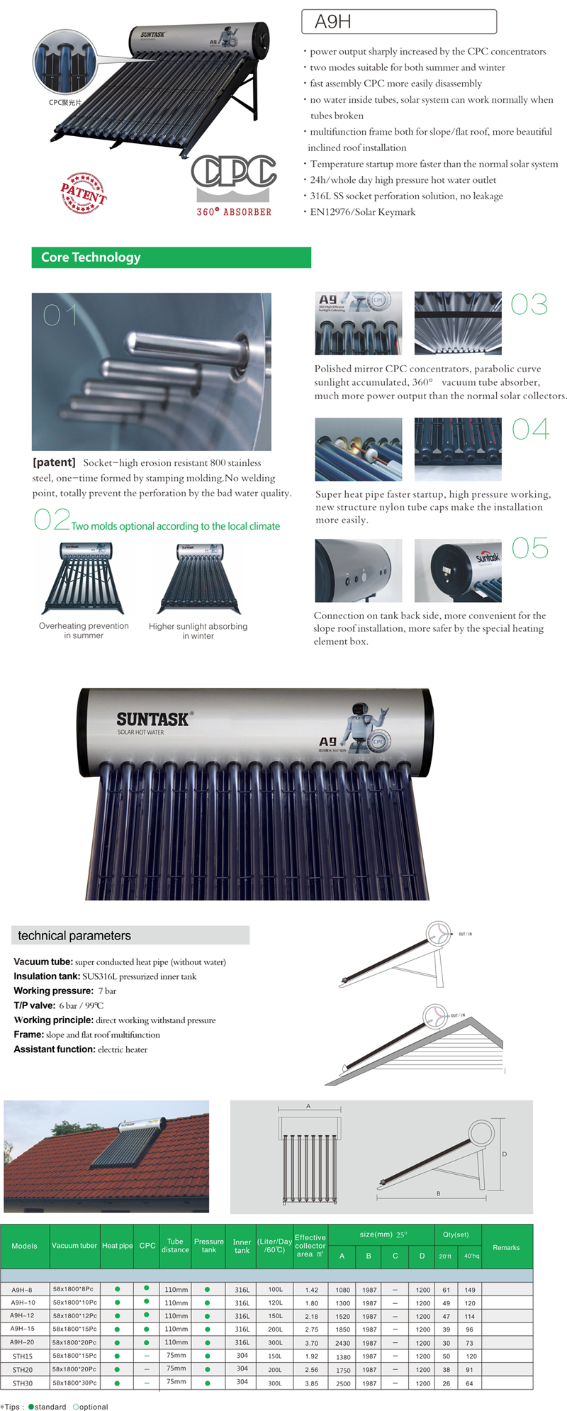 ·two modes suitable for both summer and winter ·no water inside tubes, solar system can work normally when tubes broken ·multifunction frame both for slope/flat roof, more beautiful inclined roof installation ·Temperature startup more faster than the normal solar system ·power output sharply increased by the CPC concentrators ·two modes suitable for both summer and winter ·fast assembly CPC more easily disassembly ·316L SS socket perforation solution, no leakage